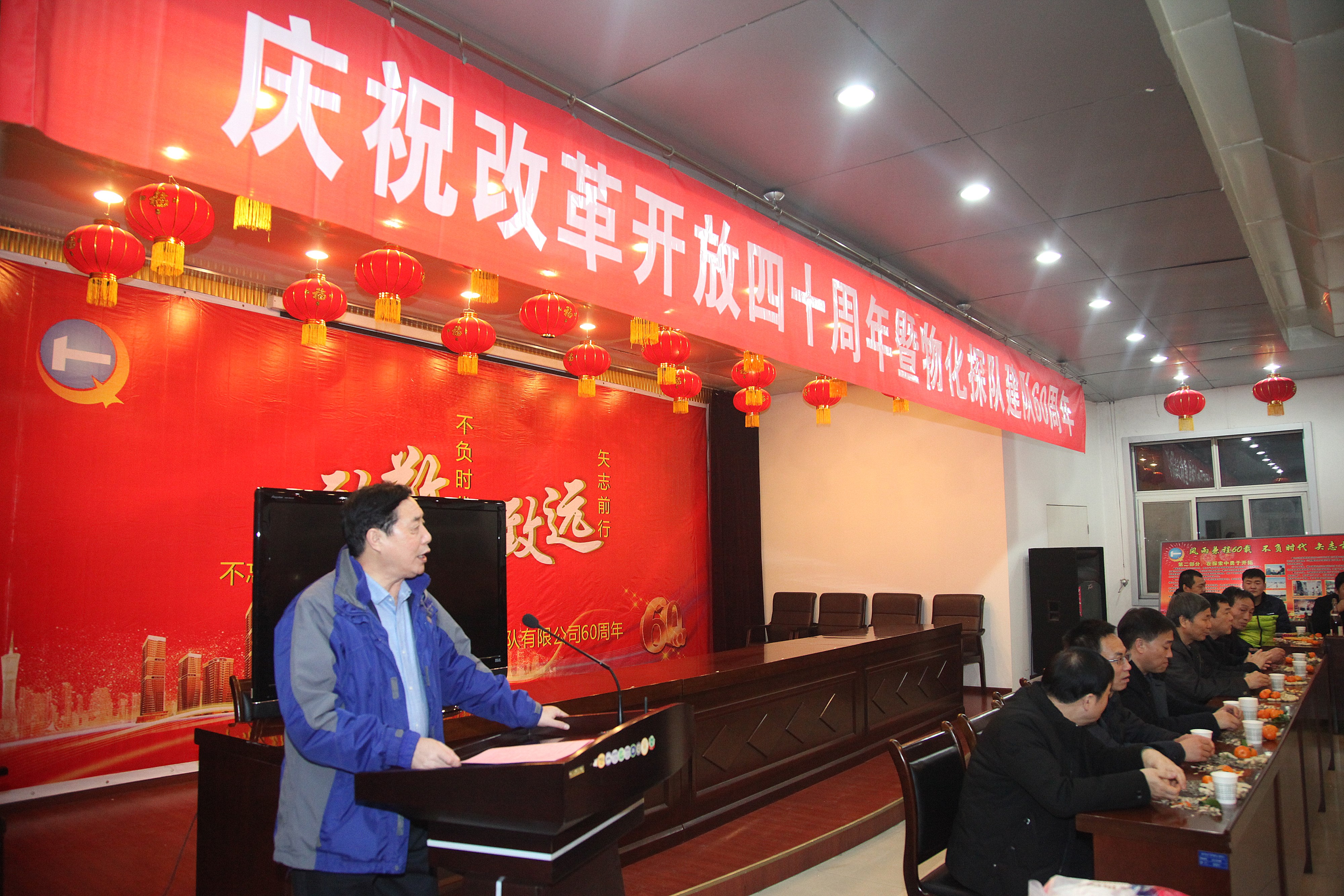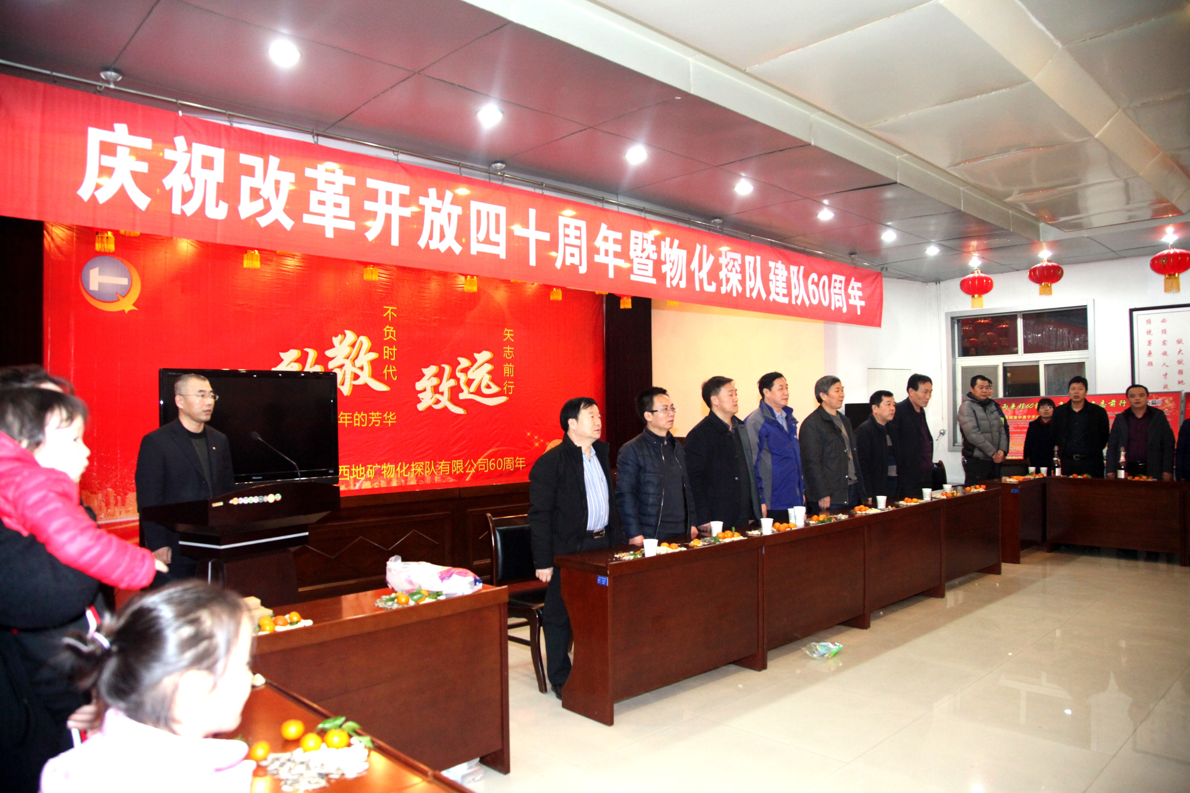 ? ? 古稀朝枚俱耐冷,仲冬如春放歌聲。12月26日物化探隊全體干部職工歡聚一堂,共同慶祝改革開放40周年暨物化探隊成立60周年。公司黨委書記,執行董事、總經理王新坪在活動中發表了熱情洋溢的致辭,黨委副書記、紀委書記李新勝同志主持活動。