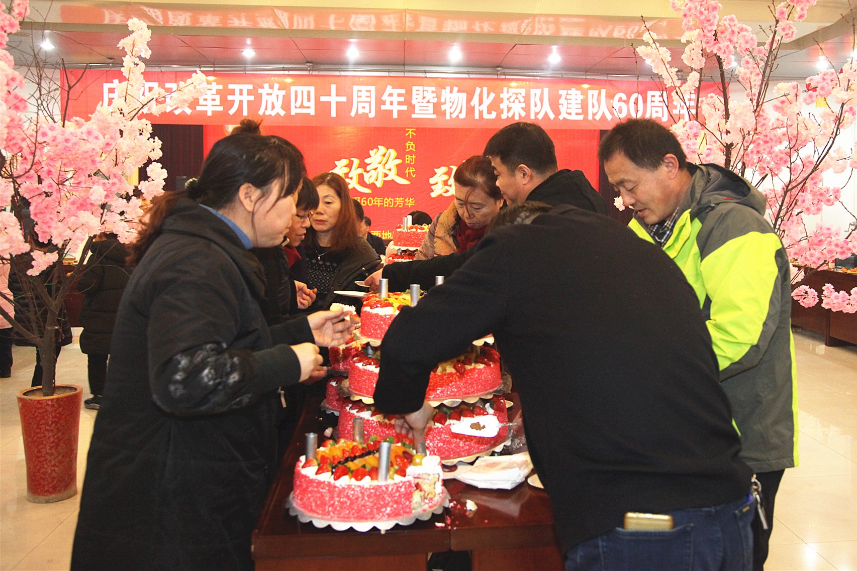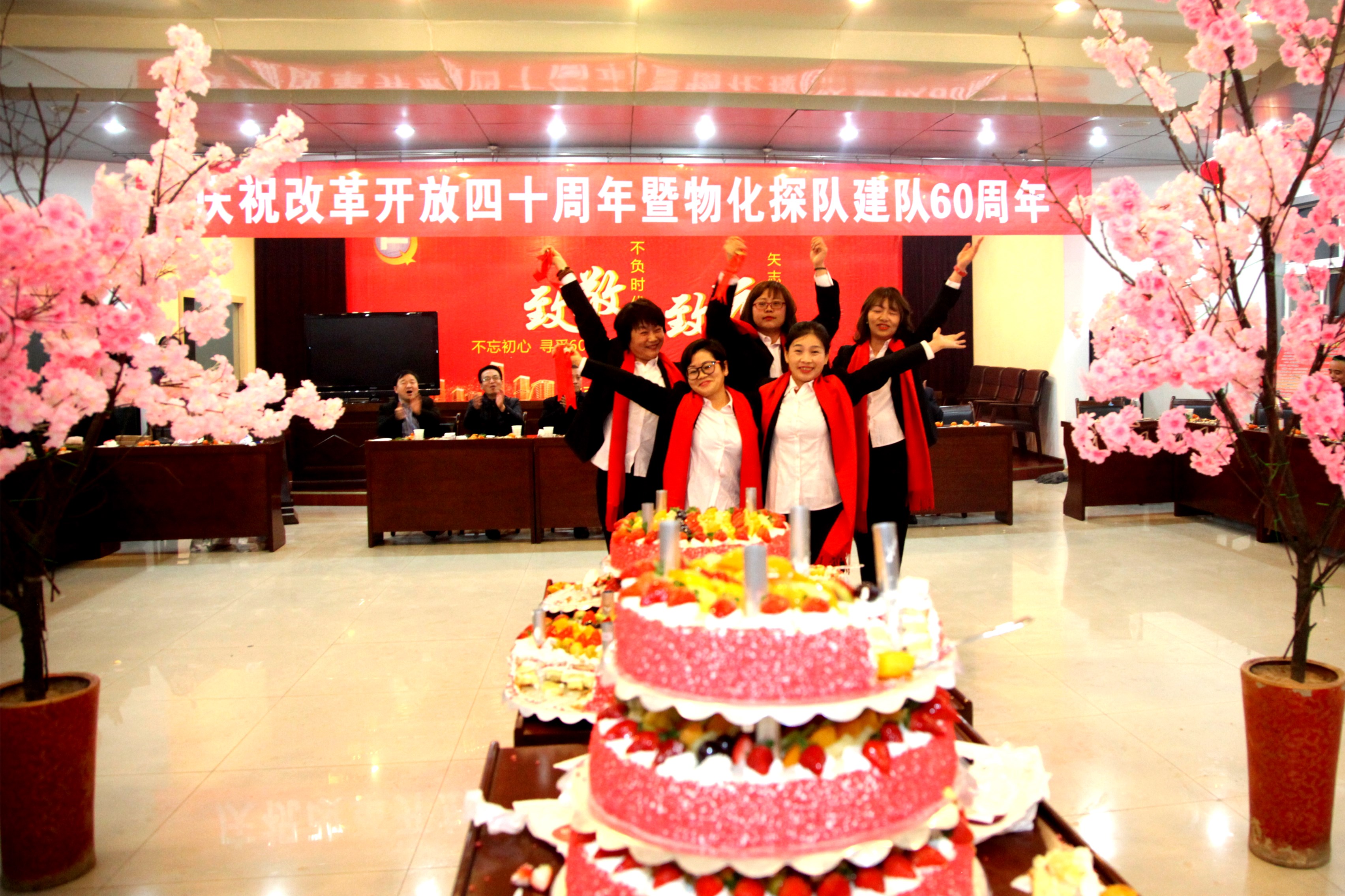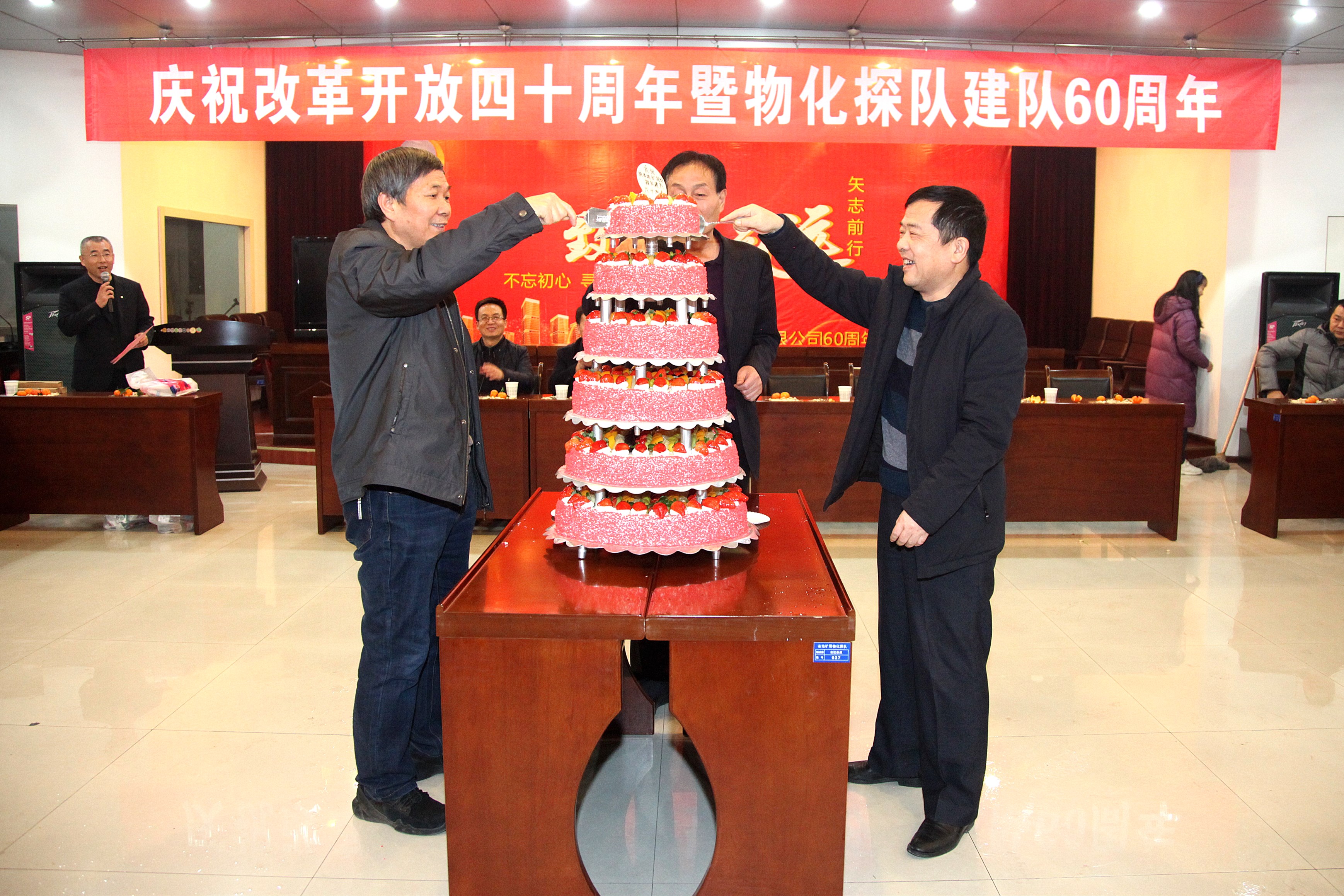 ? ? 活動中,三位副咨詢員共同切開了象征美好向上的蛋糕;用香檳開啟了美好的祝福。職工們吃著甜美的蛋糕、喝著幸福的香檳酒、共敘60年發展歷程、參觀展出、快板《物化探隊贊》、物化探隊歷史大事件的競答、一首首紅歌演唱、歡快的舞蹈等,在冬日里串起濃濃的喜悅之情。在全體職工齊唱的《東方紅》歌曲聲中慶?;顒訄A滿落下帷幕。