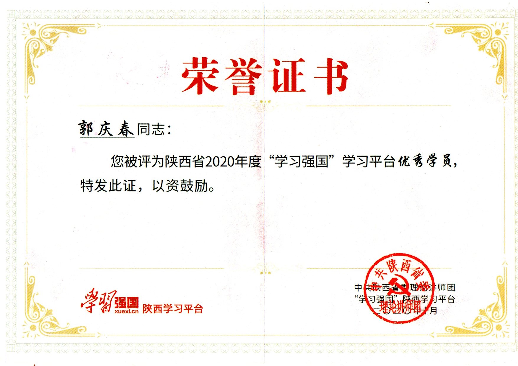 郭慶春同志榮獲“學(xué)習(xí)強(qiáng)國”省級(jí)優(yōu)秀學(xué)員稱號(hào)