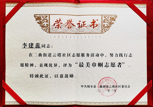 李建蕊被云塔社區(qū)評(píng)為“最美巾幗志愿者”