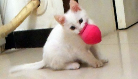 ? ? 她也變得活潑調(diào)皮起來,我下班后經(jīng)常跟她玩耍,她會(huì)躲在門后跟你捉迷藏,喜歡粘著你,你在房間里走動(dòng),它會(huì)跟在你屁股后面轉(zhuǎn),你在床上,她也跳上去跟你玩,你跟她吊臉?biāo)捕愕哪氵h(yuǎn)遠(yuǎn)地。喜歡寵物玩具娃娃,拋出去的玩具娃娃她會(huì)像小狗一樣叼到你跟前來。喜歡看電視,趴在電視跟前,和畫面打鬧,在和其它小動(dòng)物玩耍時(shí)也知道保護(hù)自己。但也有調(diào)皮任性的時(shí)候,她跳躍的能力很強(qiáng),有時(shí)你一天不在家,她會(huì)上冰箱頂、空調(diào)頂和一米多高的桌子,大鬧天宮,為這我熊過她幾次,最后算是改過了。