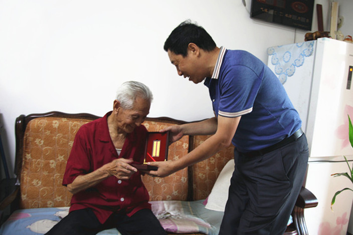 ? ? 隊長王新坪登門看望了王喜慶老人,“我代表隊黨政領導來看望慰問您,感謝您為黨、為國家、為人民作出的貢獻”。并給他送上黨中央、國務院、中央軍委授予的“中國人民抗日戰爭勝利70周年紀念章”和慰問金。王新坪躬身握住老人的手,關切詢問他的身體健康狀況、生活起居等,希望他多多保重、健康長壽,并要求隨行的有關部門負責同志要及時幫助解決老干部生活中遇到的困難。