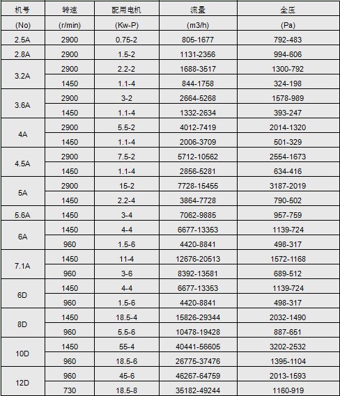 B4-72型風機的性能與選用件及地基尺寸與4-72型一致,可按其樣本選擇。該風機結構基本與4-72型相同、No2.8-6A采用B35型帶法蘭盤與底腳的電動機,No.6-12C、D電動機選用該表中與Y系列對應的YB系列,安裝形式為B3。
